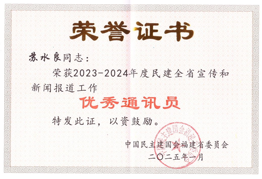 蘇水良榮獲2023-2024年度民建全省宣傳和新聞報道工作優秀通訊員