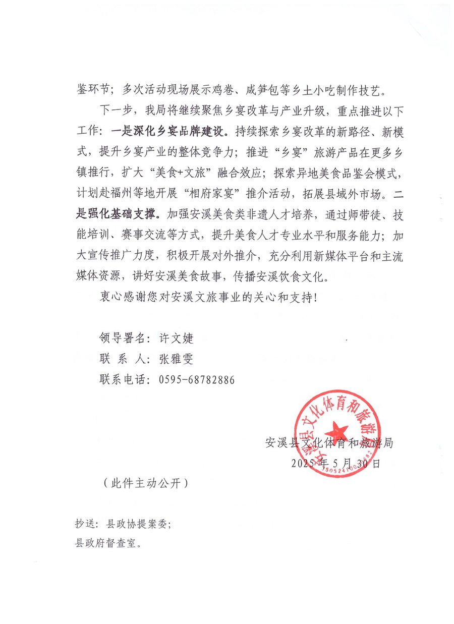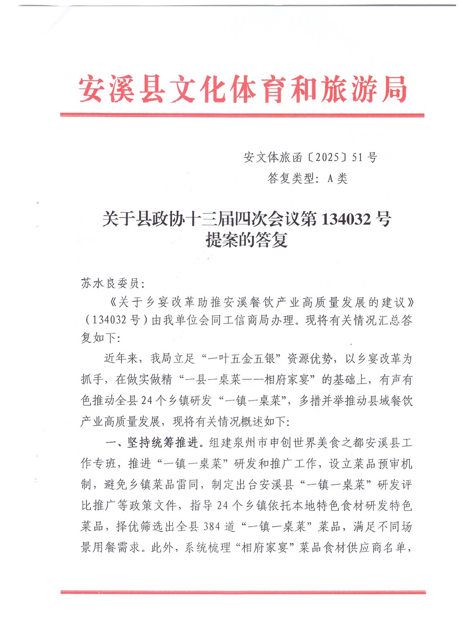 安溪縣文化體育和旅游局關(guān)于安溪縣政協(xié)十三屆四次會議第134032號提案的答復(fù)