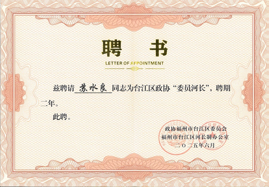 蘇水良同志聘為福州市臺江區(qū)政協“委員河長”