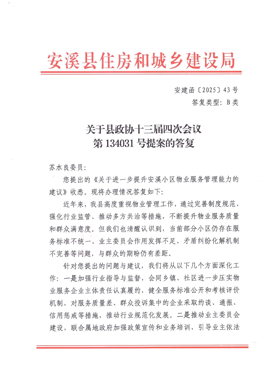 安溪縣住房和城鄉(xiāng)建設(shè)局關(guān)于安溪縣政協(xié)十三屆四次會議第134031號提案的答復(fù)