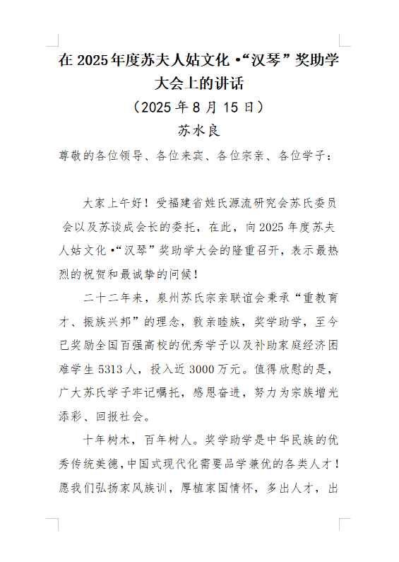 蘇水良在泉州蘇氏2025年度蘇夫人姑文化·“漢琴”獎(jiǎng)助學(xué)大會(huì)上的講話